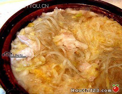 2、沙锅内加底油,热后下葱段、姜片爆香,下五花肉片略爆出油后,下酸菜同炒,加入肉汤,略顿,加入泡软的红苕粉,转中火,加盐调味,炖熟后,淋热油起锅。