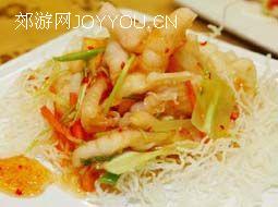 【特点】 有些微辣 【原料】 用料 去骨凤爪300克,葱头6个,洋葱半个,朝天椒2个。调料青露、青柠汁、糖各2汤匙,盐少许,辣椒粒半匙,开水2汤匙。 【制作过程】 (1)凤爪洗净煮烂。葱头、洋葱切薄片。 (2)凤爪、葱头、洋葱、朝天椒加入调料拌匀,放进冰箱冷冻后便可。