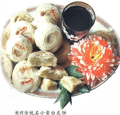 主 料: 面粉,食用油,豆沙或芋泥 做 法: 白皮饼饼皮的制作分水油皮和酥心。水油皮的制作是用面粉500克,加入食用油150克,清水200克,搅拌均匀,搓揉成面团,静置松筋1小时;酥心的制作是用面粉500克,加入花生油250克,搓揉均匀。将水油皮、酥心各分成30件,将水油皮压薄包住酥心,略为静置后,用面棍将其压成长条形,折成三折,再压成长条形,用手将其卷成圆条形,再静置一下,将其竖起,用手压下后,再用面棍将其压成薄圆形,直径约6厘米,包上甜馅(豆沙或芋泥),用手掌将其压成扁圆形,放油锅中用中火炸熟即成。 名家点评: 白皮饼是潮州小食中一种水油酥皮类的饼食,外皮白而内熟,用手工操作,其饼皮一层紧扣一层,成镙旋形,层次分明,十分好看。