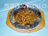 3、净锅置旺火上,放入植物油,下姜末、蒜末、干椒段及上述配料,煸炒至香,然后放入腌好的南美螺,加精盐、味精、蚝油、蒸鱼豉油、十三香、孜然粉和紫苏叶,烹入料酒,翻炒断生,淋香油,勾芡,盛入烧热的铁板中,撒葱花即成。