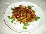 5、锅内放红油,下姜丝、干椒丝煸香,放入兔丝,加精盐、味精、蚝油、辣妹子辣椒酱翻炒均匀,撒葱段,淋花椒油、香油,出锅装入盘中,再将鹌鹑蛋围边即可。
