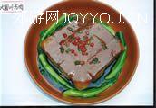 2、净锅置旺火上,放入植物油,下豆豉、干椒段炸香,加入清水,放精盐、味精、酱油、红曲粉调好色、味,淋在装有方肉的碗内,用保鲜膜封好,上笼蒸2小时至肉软烂后取出。