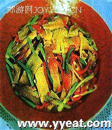 4) 随后加入葱丝、姜丝、柿子椒丝、蒜末、花椒一起煸炒,在下入鸡条煸炒,加入味精、盐、醋和少许鸡汤,盖锅焖10分钟,用水淀粉勾芡,淋香油,盛入盘中即成。