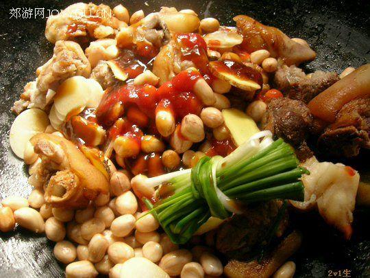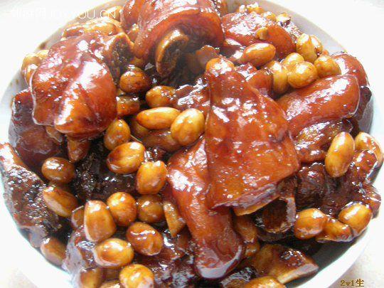 当猪手和花生都耙软、汤汁刚收尽时铲匀起锅装盘,上桌,开吃。