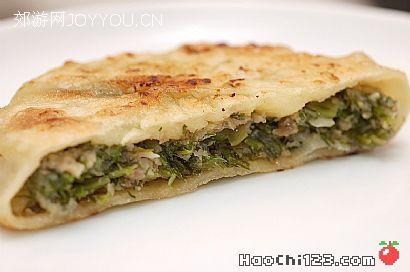 5、用包包子的方法包入馅料,再将上面压平或者略擀,注意,四周不能露馅