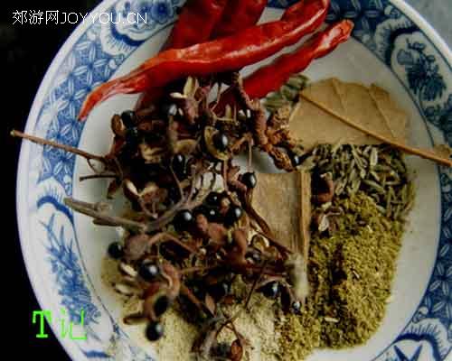 4、干辣椒数根、花椒适量、八角、桂皮、香叶少量、胡椒粉、孜然粒、孜然粉适量。