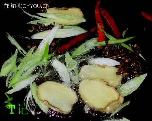 6、热锅入少许锅底油,油热后放入干辣椒,花椒爆香(千万不要糊了)然后加入其他香料(八角,桂皮,香叶,孜然粒)马上再放入葱丝姜片爆炒一下(同时一定注意火候.不要让前边的香料焦糊了)