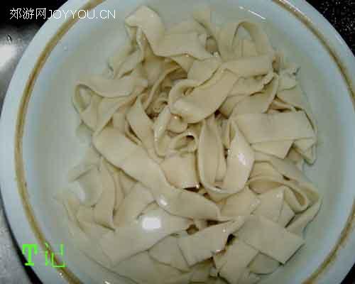 11、这时会抻面的就抻一点,不会抻的就用擀的吧.把面煮好用凉水过一下。