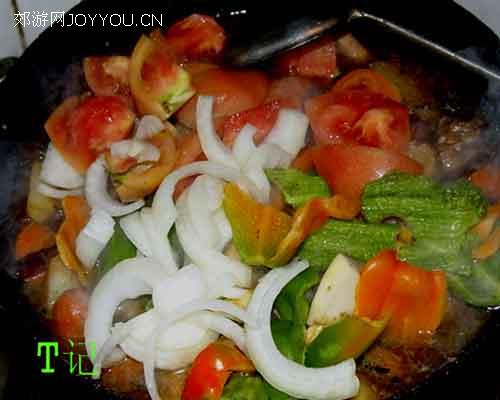12、这时(大约15分钟了)看看锅中的土豆已经熟了,就把前边备好的西红柿切成块,连同麻椒块,元葱片一起放入锅中。
