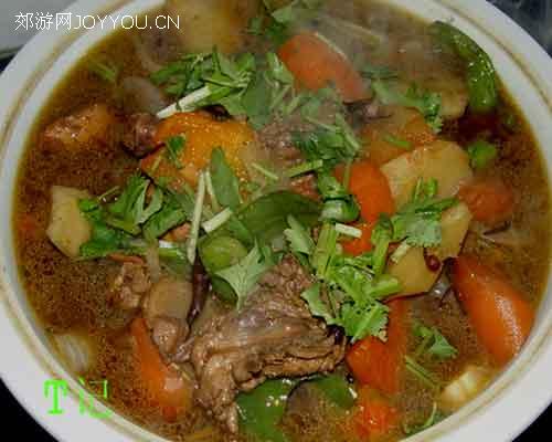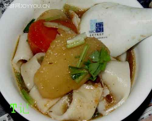 14、只有菜没有饭好像不完美,呵呵,把刚才过完凉水的宽面(好像是叫皮带面的)盛出一点,再用菜里的汤浇一下,再加点喜欢的鸡肉或是蔬菜,其他的事情就是一个字.....吃!