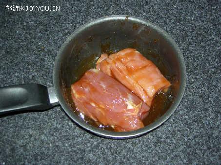 1.取不粘锅一只,放入里脊肉及1/4瓶叉烧酱,阉制约两小时,每半小时翻一下肉,注意不要加水