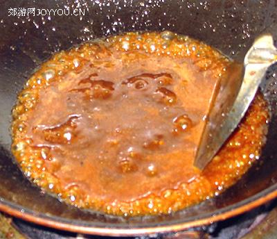 17.锅里还有一些汤呢!精华所在啊!加入少许糖和醋,味素,调好一碗底的水淀粉,下锅,大火烧开,迅速搅拌均匀,有一点粘稠的时候就起锅!