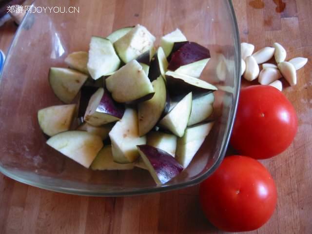 材料:茄子一个,切成角状。西红柿2个,切成牙状备用。蒜瓣适量,切成片备用。生抽,老抽,糖。植物油适量。