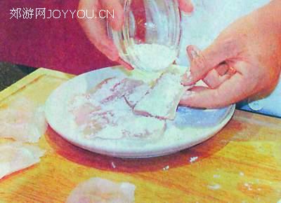 3、把备用的石班鱼柳件沾上面粉。