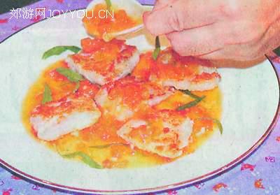 材料: 石班鱼柳250克、橙150毫升、面粉2茶匙、蒜茸1茶匙、油适量、番茄100克、盐1/4茶匙、粟粉1茶匙、糖2茶匙