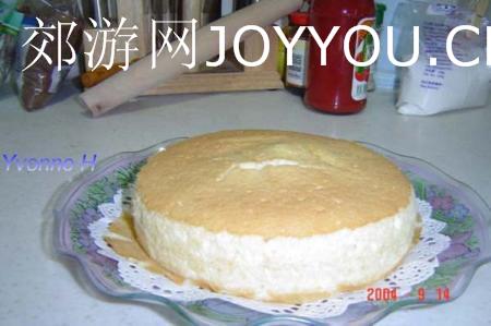 将蛋白的三分之一刮入之前的蛋黄面粉糊里轻轻拌匀,然后再将面粉糊都倒入剩下的三分之二的蛋白里,6寸蛋糕模,烤箱180度预热后,下层烤40分钟