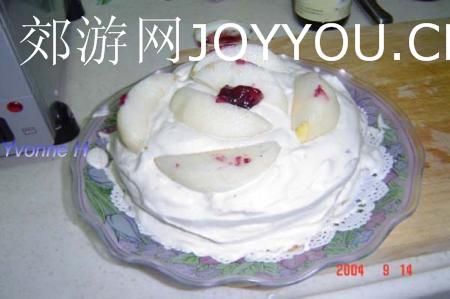 买的鸟窝的淡奶油加40G糖和10ML蓝莓果酱打发,涂在蛋糕上面,家里没水果了,只好拿个梨来装饰拉,偶装饰的奶油真不是一般的丑啊,汗~~~