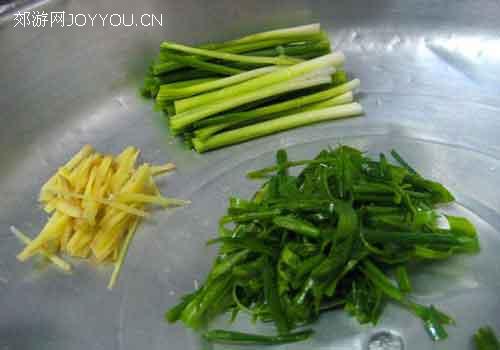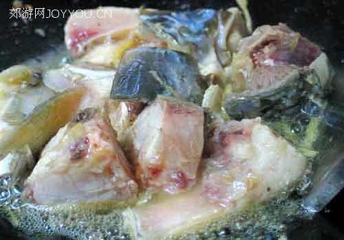 把姜丝下油锅爆香,倒入鱼头,炒一会儿