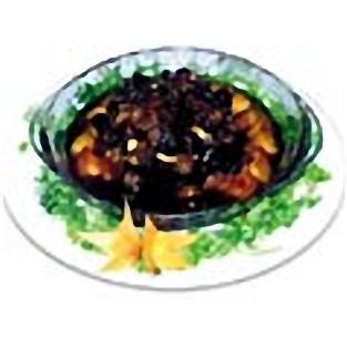 (3)锅上大火烧热,倒入色拉油,放入蒜头、葱姜,煸香后倒入乌龟肉和肋条肉煸至有香味,烹入绍酒和酱油烧至入味后加入汤汁焖至酥烂,加入白糖、味精少许,稠浓卤汁,出锅装盘即成。