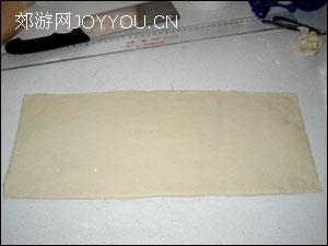 11、把三折好的面片再擀开,擀成厚度为0.6CM、宽度为20CM、长度为35-40CM的面片。用壁纸刀切掉多余的边缘进行整型。