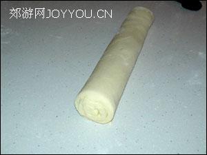 12、将面片从较长的这一边开始卷起来。