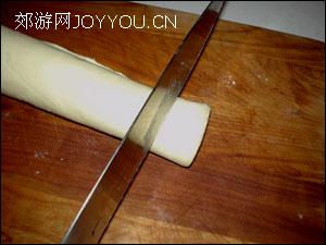 14、松弛好的面卷用刀切成厚度1CM左右的片。
