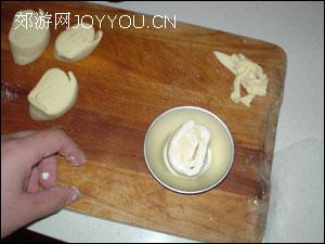 15、放在面粉中沾一下,然后沾有面粉的一面朝上,放在未涂油的塔模里。用两个大拇指将其捏成塔模形状。
