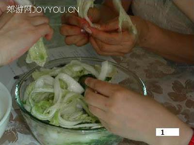 第一步:买5斤大白菜,分成一片一片的,用适量的盐腌起来,放大约15-24小时,白菜萎缩了以后最初步的的材料就好了。