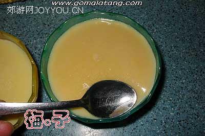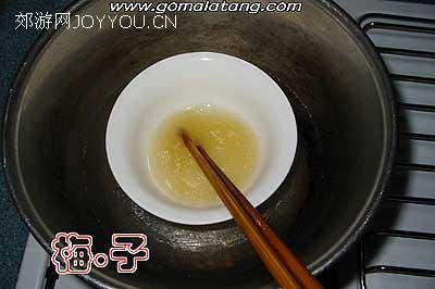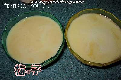 4、鱼胶粉10ML,水20ML拌匀隔水加热溶解后,加入蛋液中拌匀。