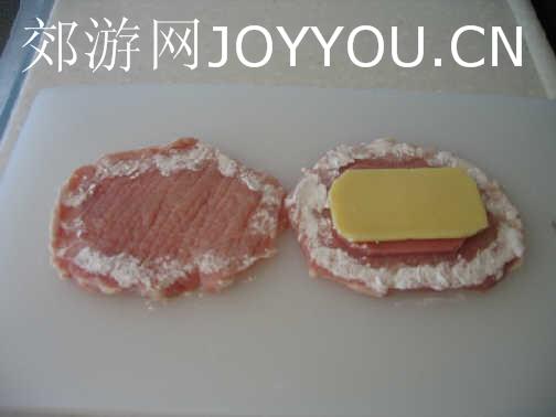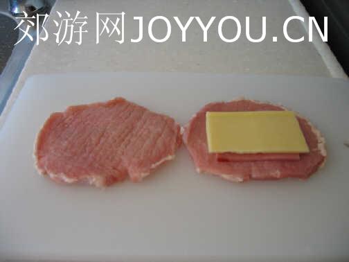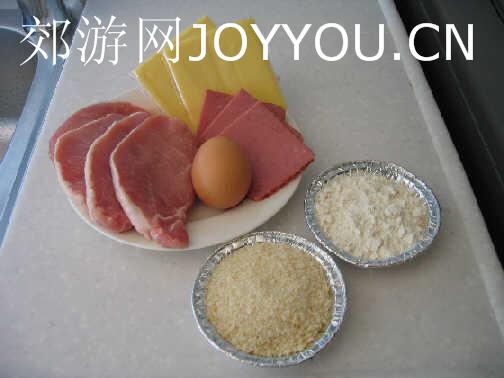 材料:里脊肉、起司片、火腿片、鸡蛋、面粉、面包渣。