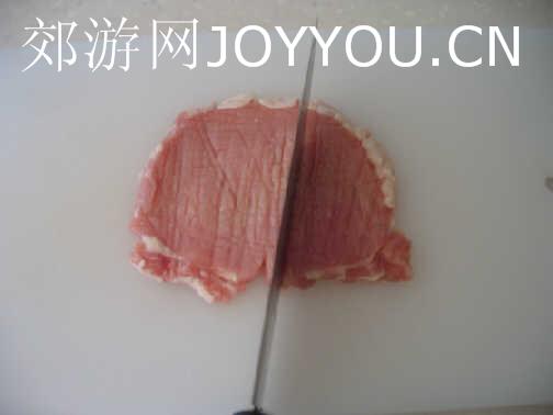 用刀背或打肉器把里肌肉拍松、厚度稍拍薄,并且把周围不规则的肉切除,最好是每一块肉都差不多大小,打的力別太重,也別打的太薄唷!不然炸出来的肉不夠厚,吃起来不过瘾!