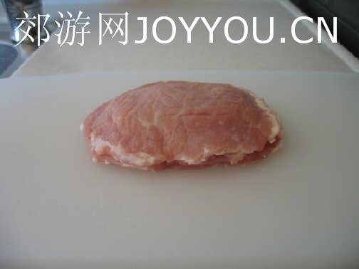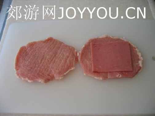 取两块大小差不多的肉,在肉上叠上一片火腿,火腿要比肉小喔!(这点很重要)