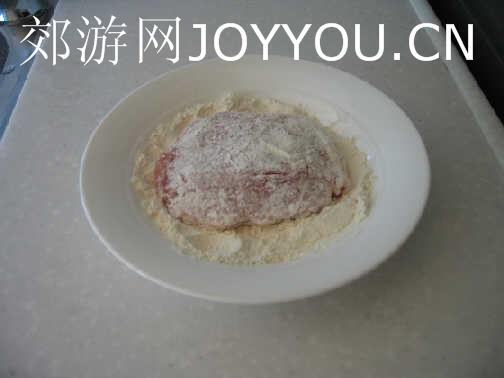 把肉沾上一层面粉,要沾的均匀一点,沾好拿起时稍微轻拍肉身,把多余的面粉拍掉。