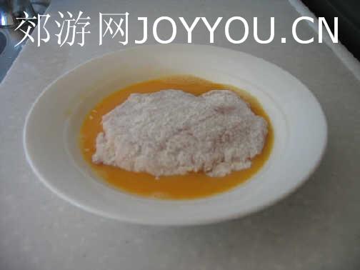 沾了面粉的肉再沾上一层蛋液。