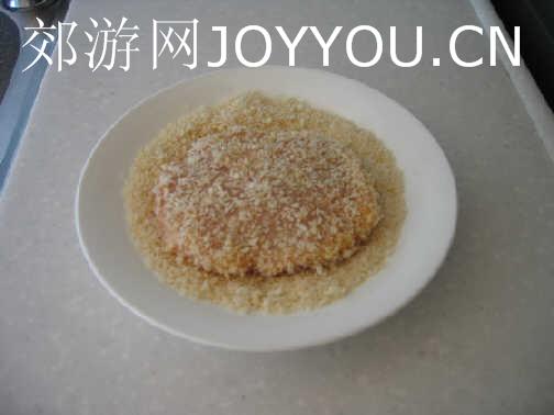 最后再沾一层面包渣,沾面包渣时可以用点力压一下,让面包渣粘的更扎实。