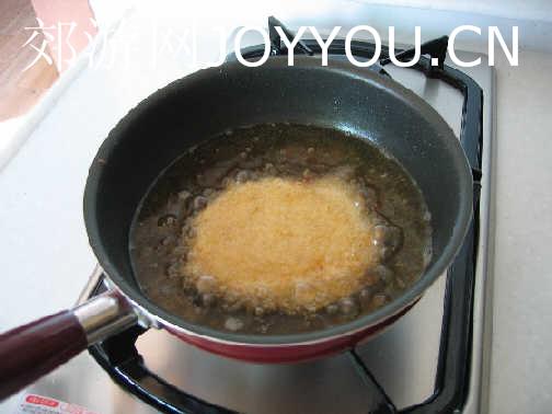 正反面重复多压几次,直到看不到肉身为止,沾好拿起时稍微轻拍肉身,把多余的面包渣拍掉。