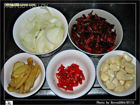 2、准备适量姜片、蒜瓣、洋葱、剁椒、泡椒、干海椒、桂皮、八角等备用!