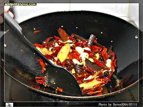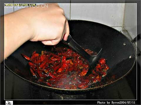 3、锅烧热加油,油6分热时放干海椒、桂皮、八角炒香!