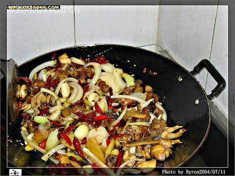 5、将备好的鸡块、洋葱放入锅中翻炒!