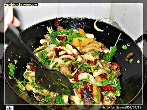 6、起锅前将洗净的香菜、香葱放入锅中,略为翻炒!