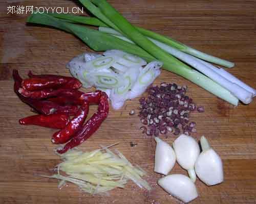 5、辣椒、花椒、葱姜蒜蒜苗等配料。
