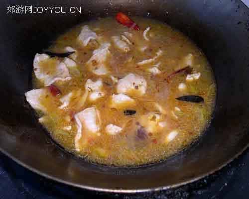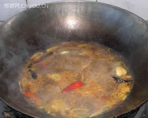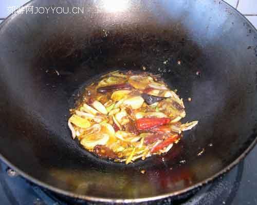 6、放少许油把郫县豆瓣酱炒香下入少量辣椒及葱姜蒜。