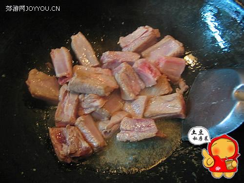 另起锅,姜片爆香,放入排骨炒至变色,加少许生抽和糖调味,盛出。