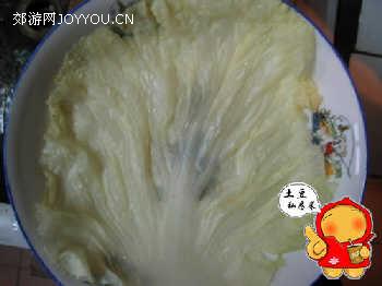 3。取白菜叶一张,在沸水中烫一下,沥干,铺在盘子底部;