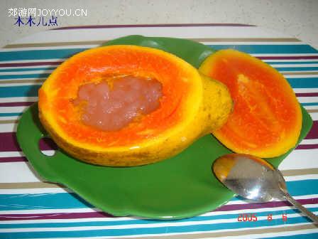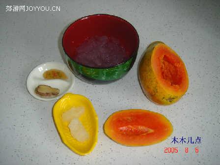 木瓜用刀在侧边切一个小口(切下的做盖),挖去籽(如果有挖球器,可以在里面挖一些果肉),然后锅内烧水加入姜汁,放入哈士膜油煮至透明,加果肉、放冰糖熬化,放入木瓜中。