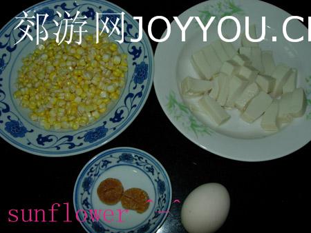 玉米豆腐鸡蛋羹所需材料:豆腐1块,玉米粒(我不喜欢那些速冻的玉米粒,买的新鲜的)约1碗的份量,干贝(瑶柱)2粒,鸡蛋1个。