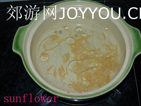砂锅烧热,爆油,待油热后注入暖水(放冷水砂锅会裂哦,偶手一抖,油倒多了。),将瑶柱连浸泡的水一起倒入锅中。