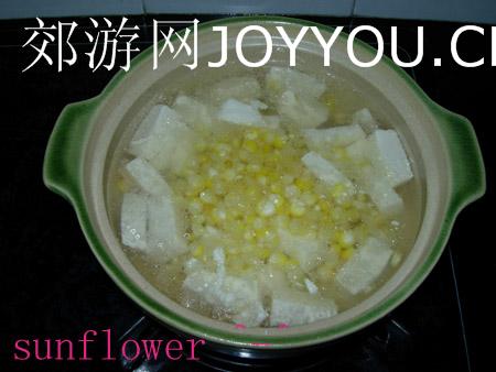 待锅内的水烧开后将豆腐及玉米粒一起倒入锅,再次烧开后转小火煮十五分钟。