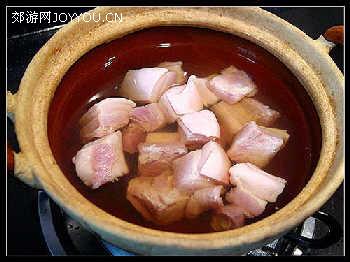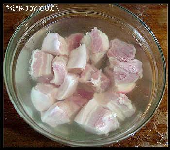 将肉切成麻将牌大小正方形的块,肉不要切得太小,太小易缩易碎,没有卖相了。切完后,用冷水浸没,水中放半杯料酒。放在水中浸,可以浸去毛细血管中的血水;水中加酒易于肉纤维吸收,去除肉腥。肉不宜多浸,多浸则鲜味尽失,一般浸十五分钟左右即可。