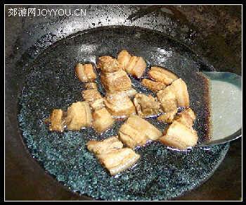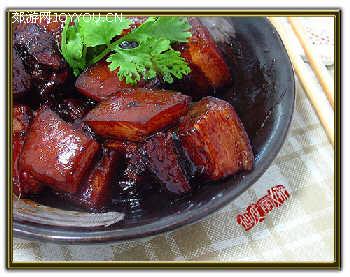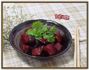 肉要烧得用筷轻戳可通,然后换到铁炒锅里,不加盖烧,这时加入老抽和盐,小火继续炖。半个小时后转中火加糖。随时轻翻,待到收汁,稍微粘稠即可。